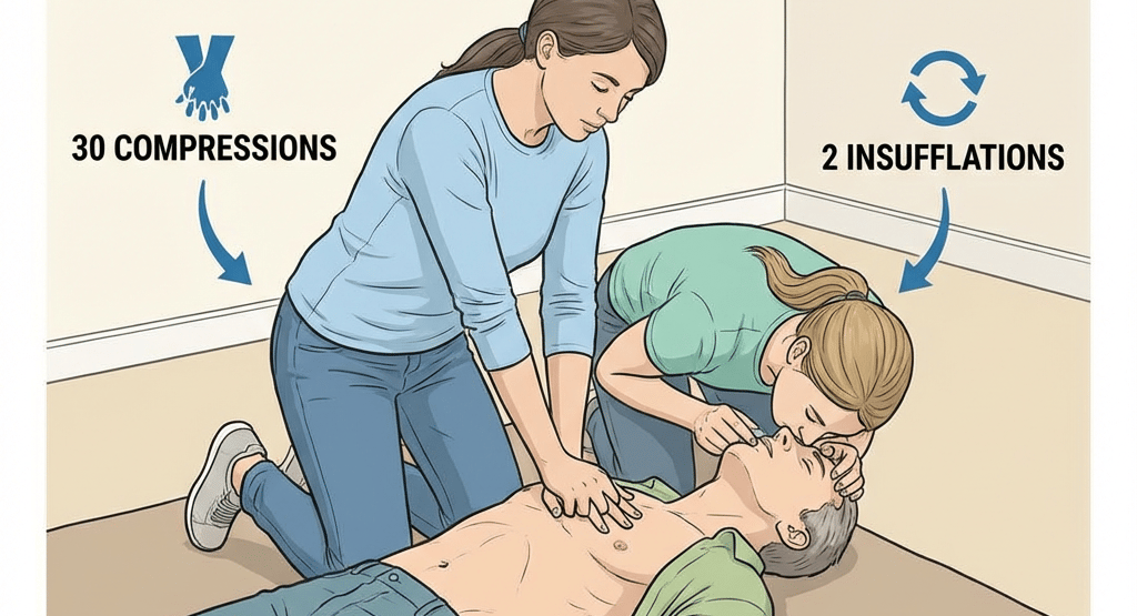 Les compressions thoraciques maintiennent une circulation sanguine artificielle tandis que les insufflations apportent de l’air riche en oxygène dans les poumons. Cette combinaison est vitale pour optimiser la survie de la victime.