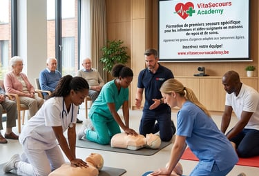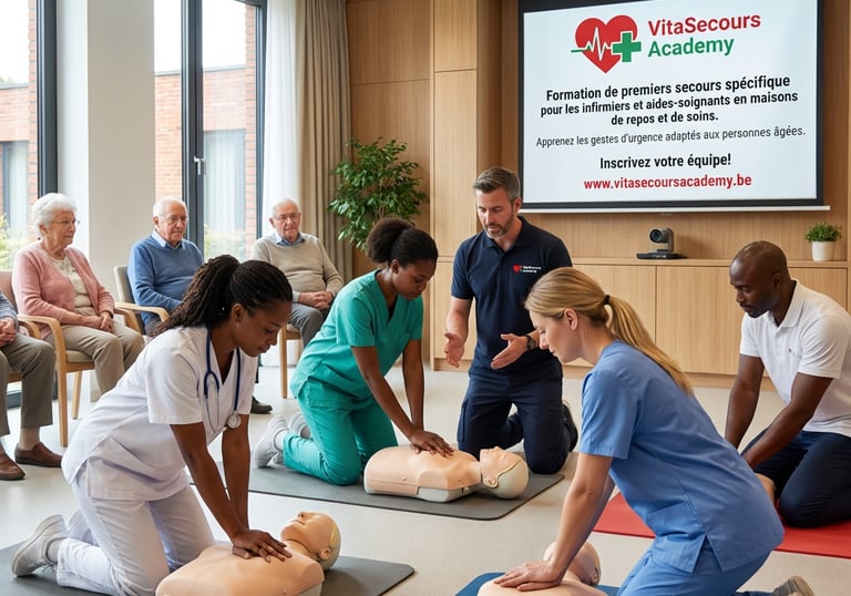 Formation de premiers secours spécifique pour les infirmiers et aides-soignants en maisons de repos et de soins. Apprenez les gestes d’urgence adaptés aux personnes âgées. Inscrivez votre equipes!